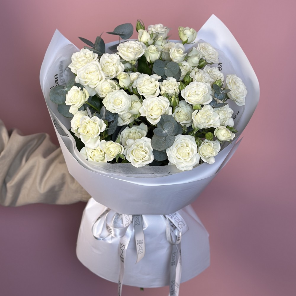 Этот букет сразу создаёт ощущение праздника и радости. Пышные кустовые розы насыщенного розового оттенка выглядят объёмно, сочными и очень «живыми», а веточки эвкалипта добавляют свежести и лёгкого контраста. Вместе они создают гармоничную композицию, которая смотрится эффектно, но при этом остаётся элегантной и стильной.Он подойдёт для яркой девушки или женщины, для дня рождения, признания в чувствах, поздравления с важным событием или просто как красивый жест без повода, когда хочется по-настоящему порадовать.В интерьере такой букет станет акцентом: в гостиной, спальне, студии или даже в офисе он сразу притягивает взгляд и наполняет пространство цветом и энергией.Этот букет любят за его «вау-эффект». Он поднимает настроение с первого взгляда, выглядит щедро и дорого, и оставляет ощущение, что подарок выбран с душой и вкусом.