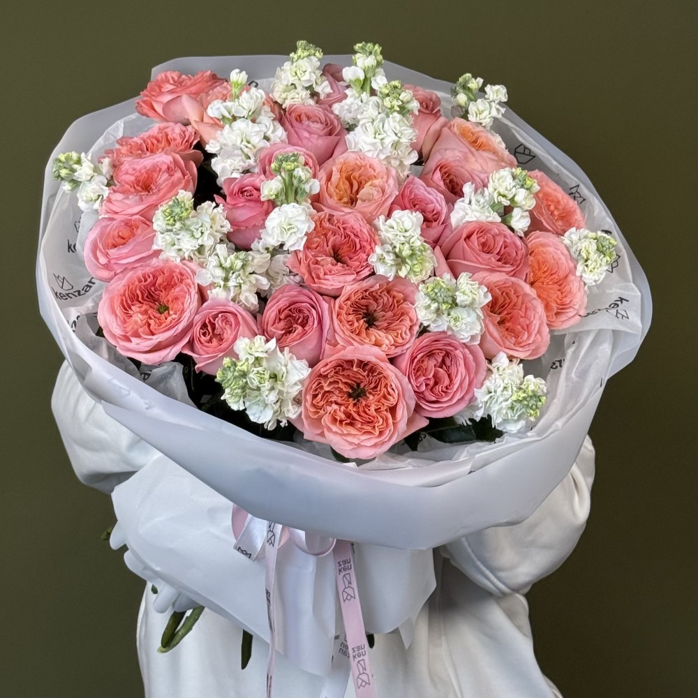 Возможна частичная замена цветка в букете с сохранением общей стилистики и стоимости.